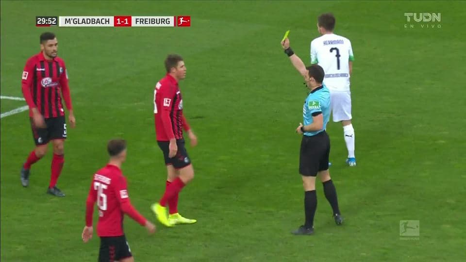Tarjeta amarilla. El árbitro amonesta a Dominique Heintz de Sport-Club Freiburg on December 1, 2019