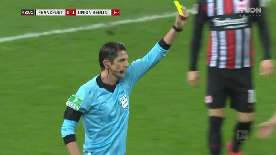 Tarjeta amarilla. El árbitro amonesta a Florian Hübner de 1. FC Union Berlin