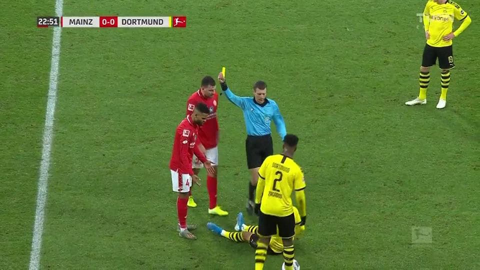 Tarjeta amarilla. El árbitro amonesta a Jeremiah St. Juste de 1. FSV Mainz 05 on December 14, 2019
