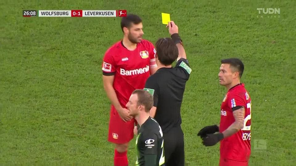 Tarjeta amarilla. El árbitro amonesta a Kevin Volland de Bayer 04 Leverkusen