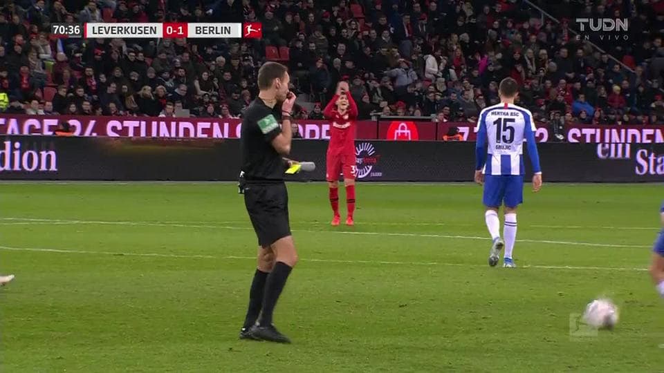 Tarjeta amarilla. El árbitro amonesta a Kevin Volland de Bayer 04 Leverkusen on December 18, 2019
