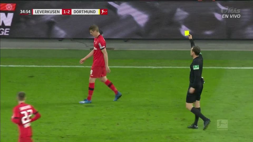 Tarjeta amarilla. El árbitro amonesta a Lars Bender de Bayer 04 Leverkusen on February 8, 2020