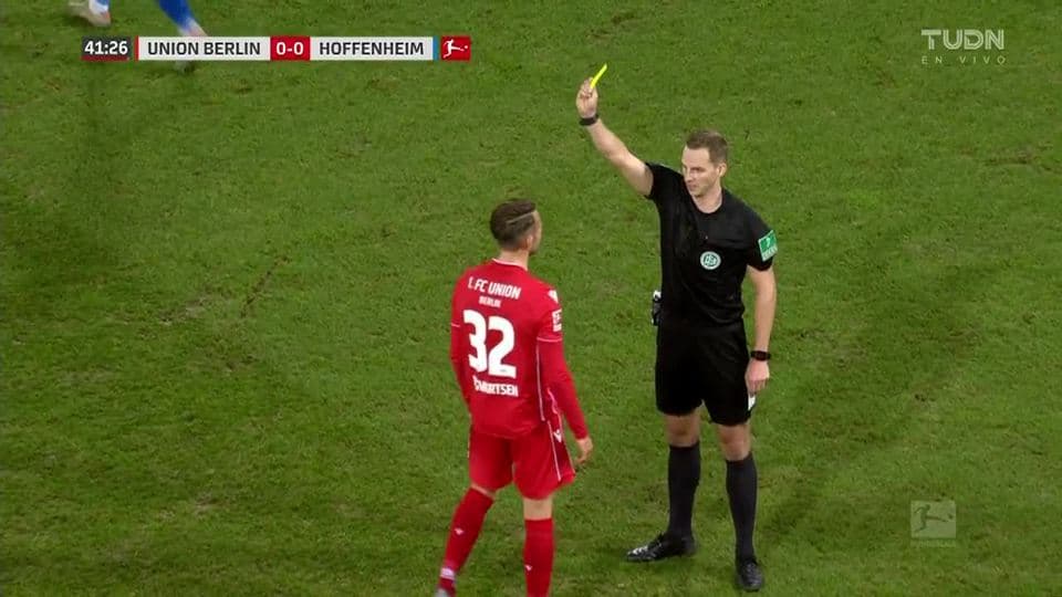 Tarjeta amarilla. El árbitro amonesta a Marcus Ingvartsen de 1. FC Union Berlin