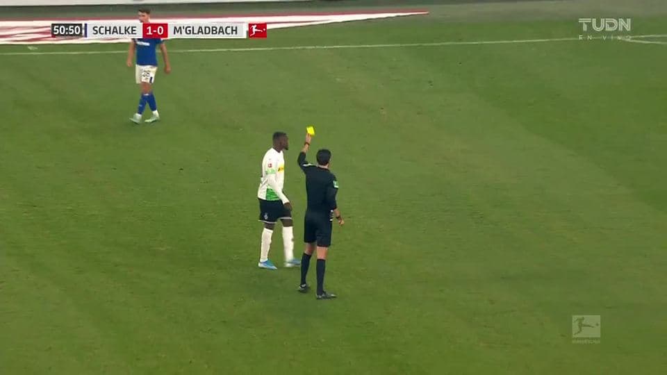 Tarjeta amarilla. El árbitro amonesta a Marcus Thuram de Borussia Mönchengladbach