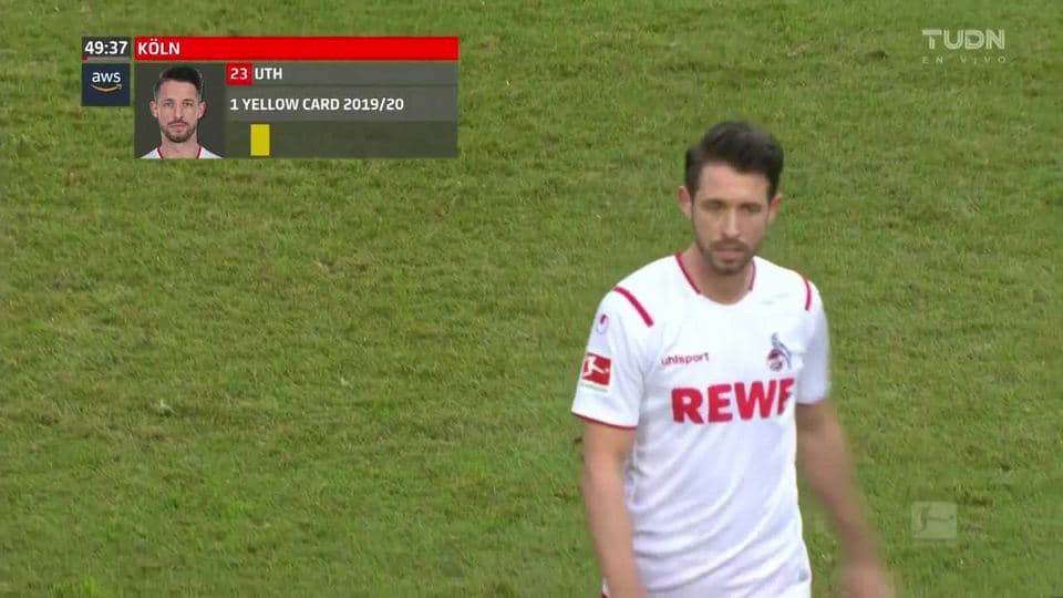 Tarjeta amarilla. El árbitro amonesta a Mark Uth de 1. FC Köln
