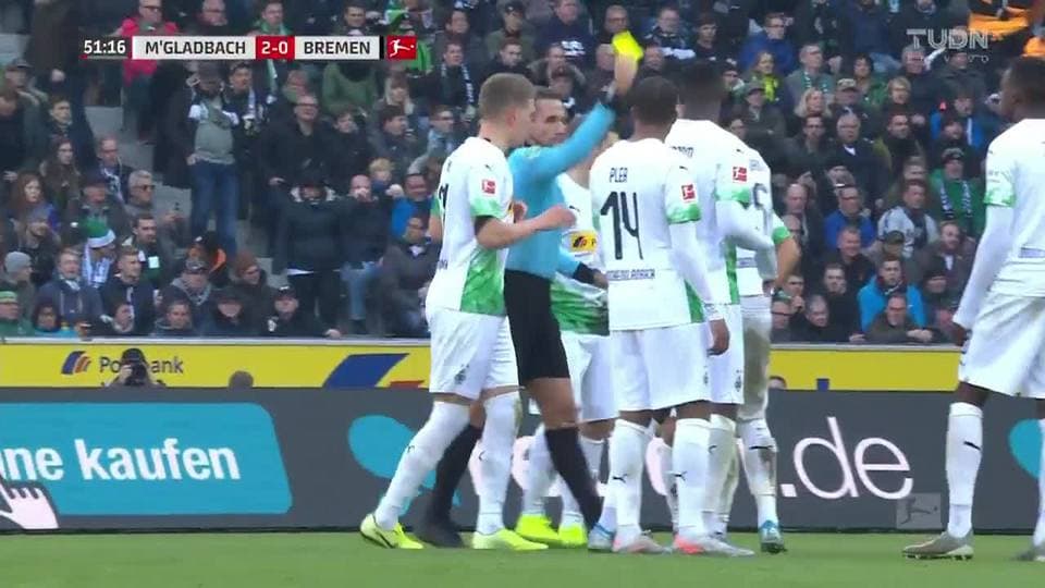 Tarjeta amarilla. El árbitro amonesta a Ramy Bensebaini de Borussia Mönchengladbach on November 10, 2019