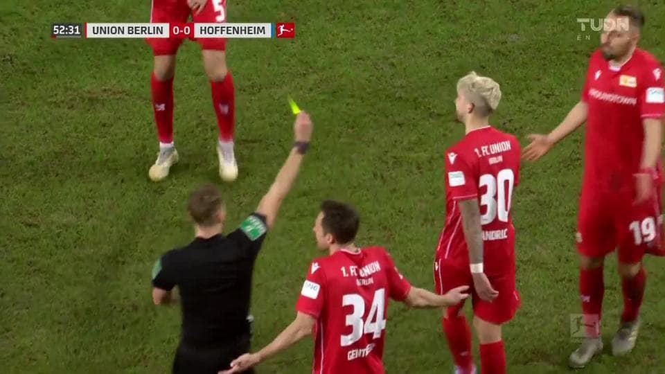 Tarjeta amarilla. El árbitro amonesta a Robert Andrich de 1. FC Union Berlin