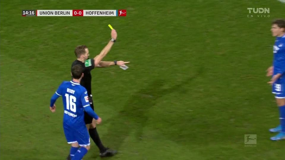 Tarjeta amarilla. El árbitro amonesta a Robert Skov de TSG 1899 Hoffenheim