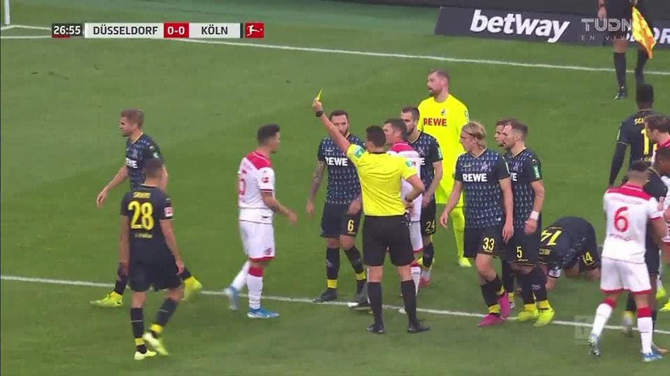 Tarjeta amarilla. El árbitro amonesta a Simon Terodde de 1. FC Köln