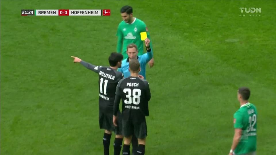 Tarjeta amarilla. El árbitro amonesta a Stefan Posch de TSG 1899 Hoffenheim