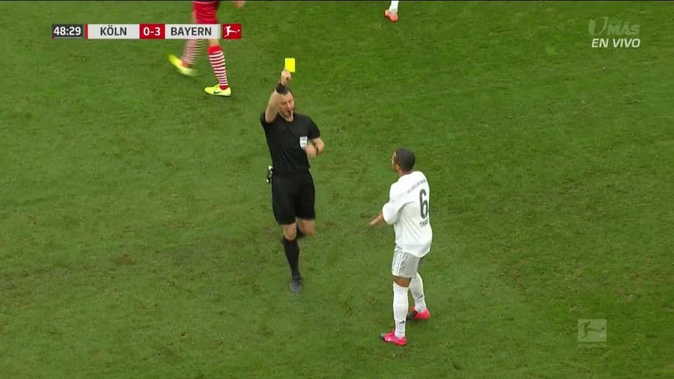 Tarjeta amarilla. El árbitro amonesta a Thiago de FC Bayern München