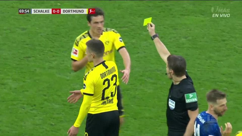Tarjeta amarilla. El árbitro amonesta a Thorgan Hazard de Borussia Dortmund