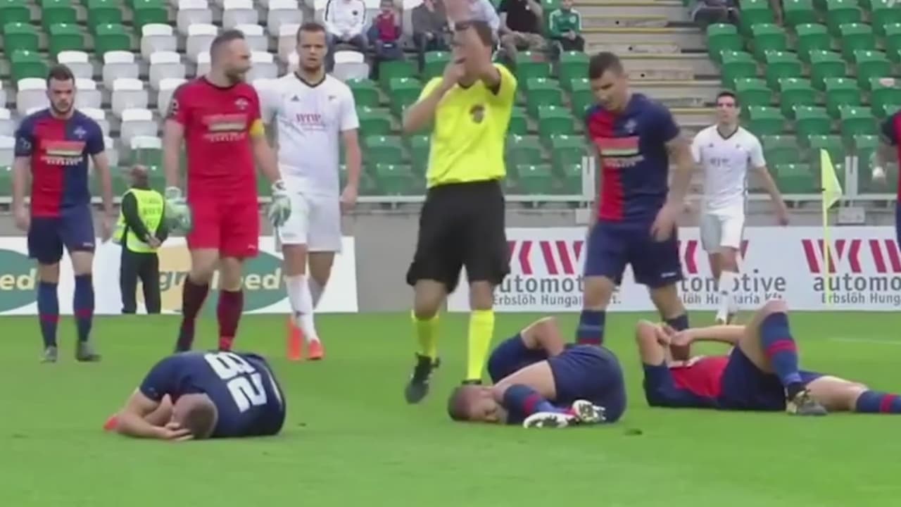 Mucho trabajo tuvo el médico de este equipo de la Segunda División del fútbol de Hungría, luego de que tres de sus jugadores permanecieran en el piso retorciéndose del dolor.