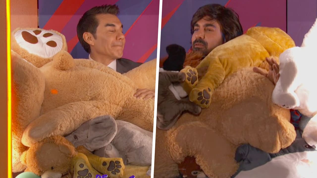 El personaje al que da vida Ariel Miramontes visitó el estudio de De Noche Pero Sin Sueño y fue retado por el conductor a un divertido reto de preguntas sobre cultura general, que involucró una cabina y muchos peluches que serían lanzados al interior cada que uno de ellos respondiera incorrectamente o si el otro acertaba en su respuesta.