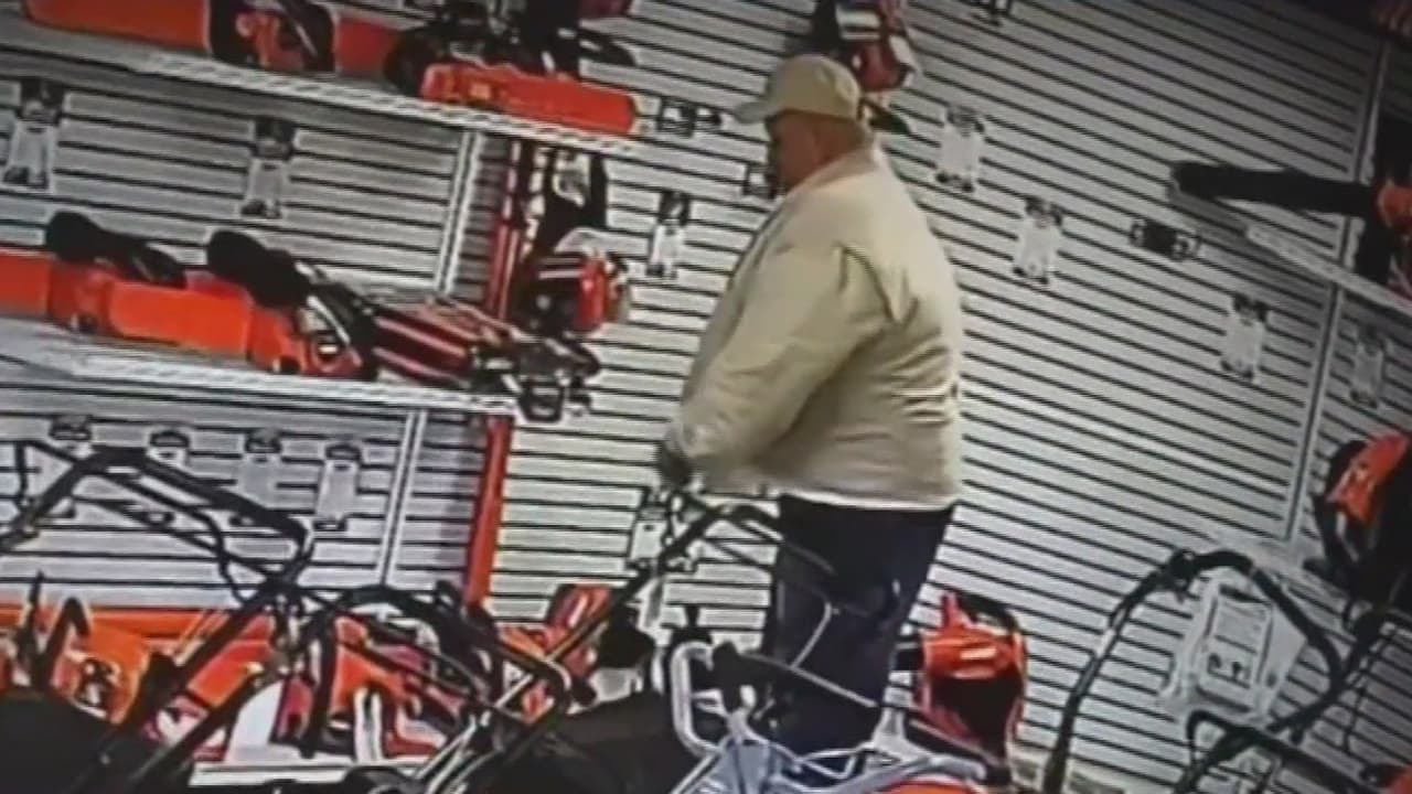 Bajo la ropa, este hombre roba sigilosamente una sierra eléctrica y ahora lo buscan por este video