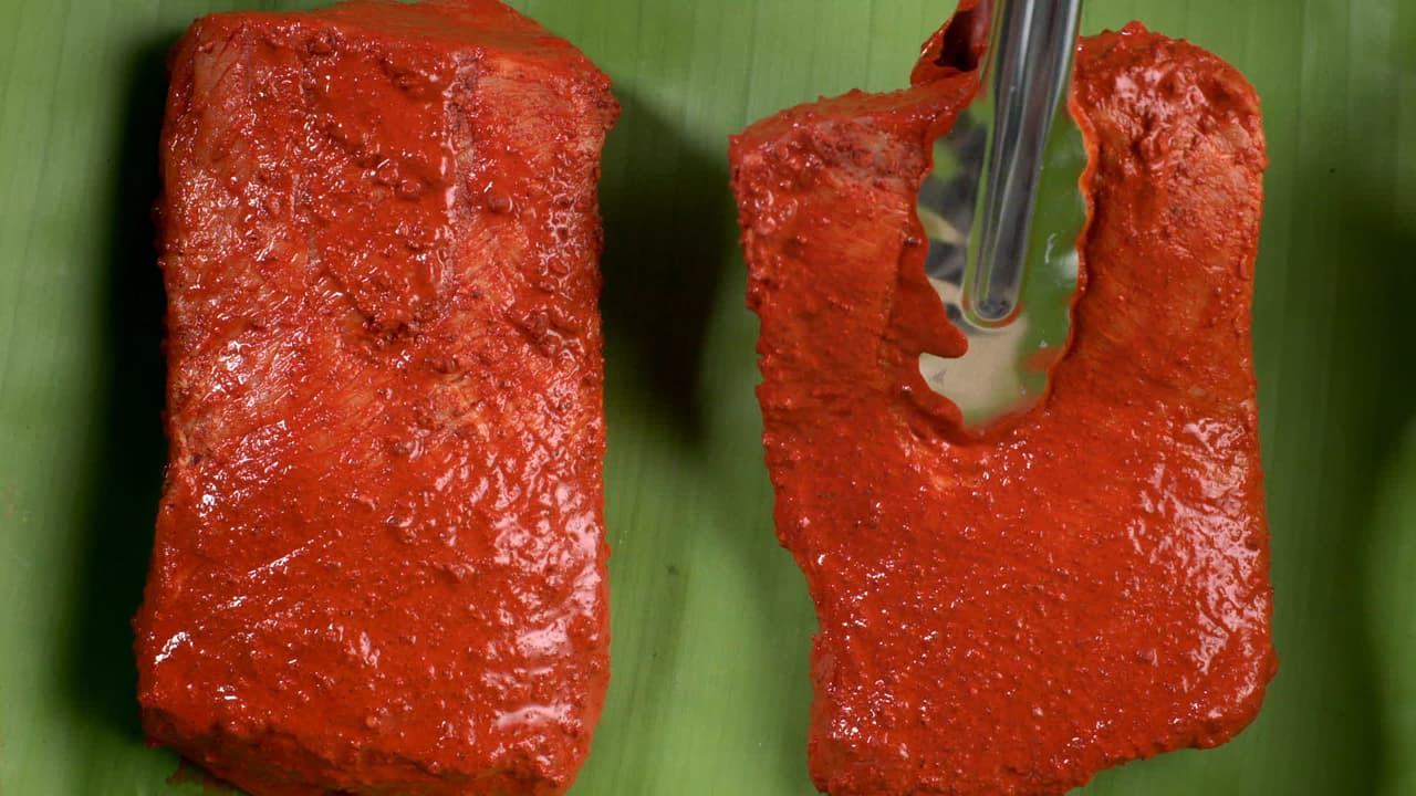 5- Ablandar las hojas de plátano directamente al fuego y colocarlas en un molde refractario. 6- Colocar la carne con su marinada en las hojas, bañar con manteca de cerdo derretida y tapar con las hojas de plátano.