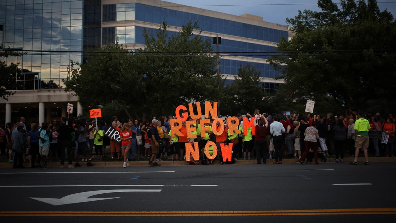Demandan un alto a la violencia con armas afuera de la sede de la Asociación Nacional del Rifle en Virginia