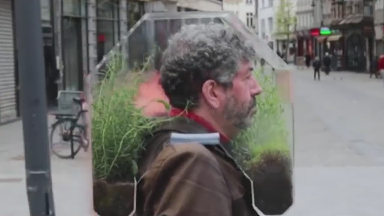 Un artista belga creó hace 15 años un pequeño invernadero de plexiglás que se coloca sobre los hombros y está repleto de aire purificado gracias a sus plantas aromáticas. La pandemia del coronavirus lo hizo la protección ideal que cualquiera querría.