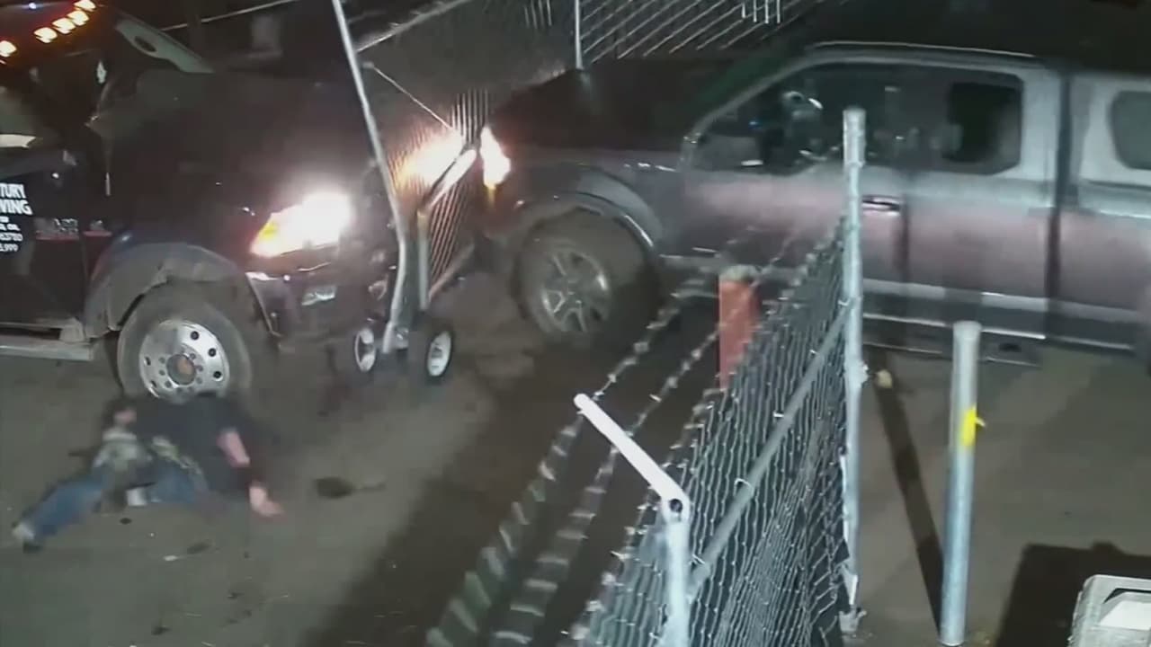El impactante momento en que ladrones golpean con un camión robado al conductor de una grúa