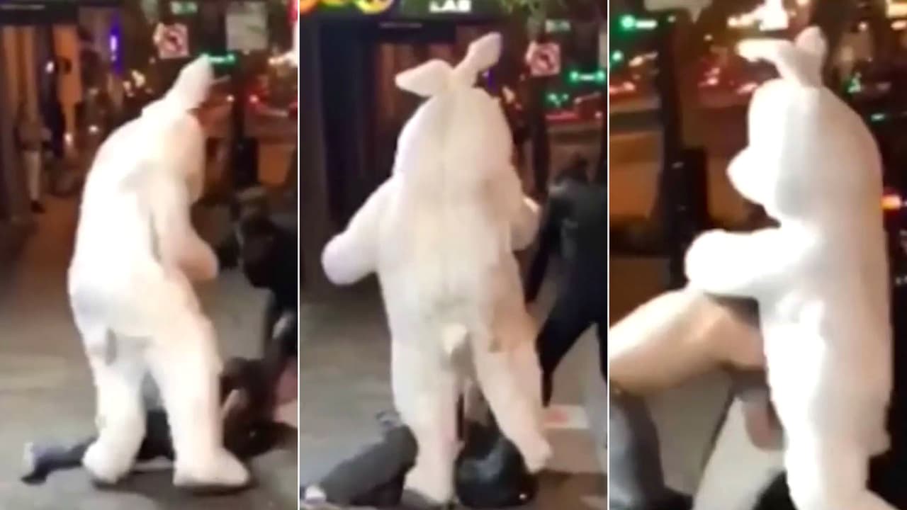 Las imágenes del momento en que un hombre disfrazado de conejo de Pascua se involucra en una pelea para intentar detenerla se han vuelto virales. La policía tuvo que intervenir para calmar la furia de este peculiar justiciero.