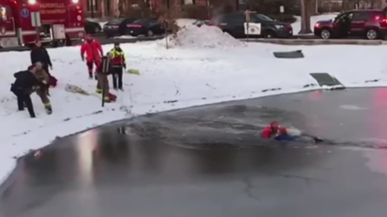 En las imágenes se puede apreciar como el niño, de 11 años, lucha por su vida tras romperse el hielo de un lago en Illinois. Los socorristas intentan rescatarlo primero con ayuda de una cuerda, hasta que uno de ellos se tira al agua helada para sacarlo.
