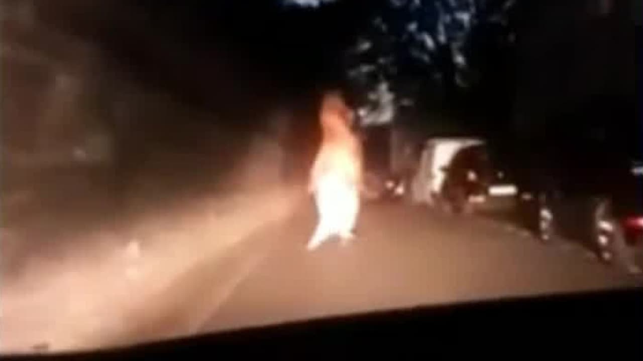 La graciosa escena ocurrió en Inglaterra. Los agentes dentro de la patrulla ríen y bromean durante la cacería, que desata la destreza del hombre dentro del incómodo disfraz. No se sabe el motivo ni en qué termina la persecución.