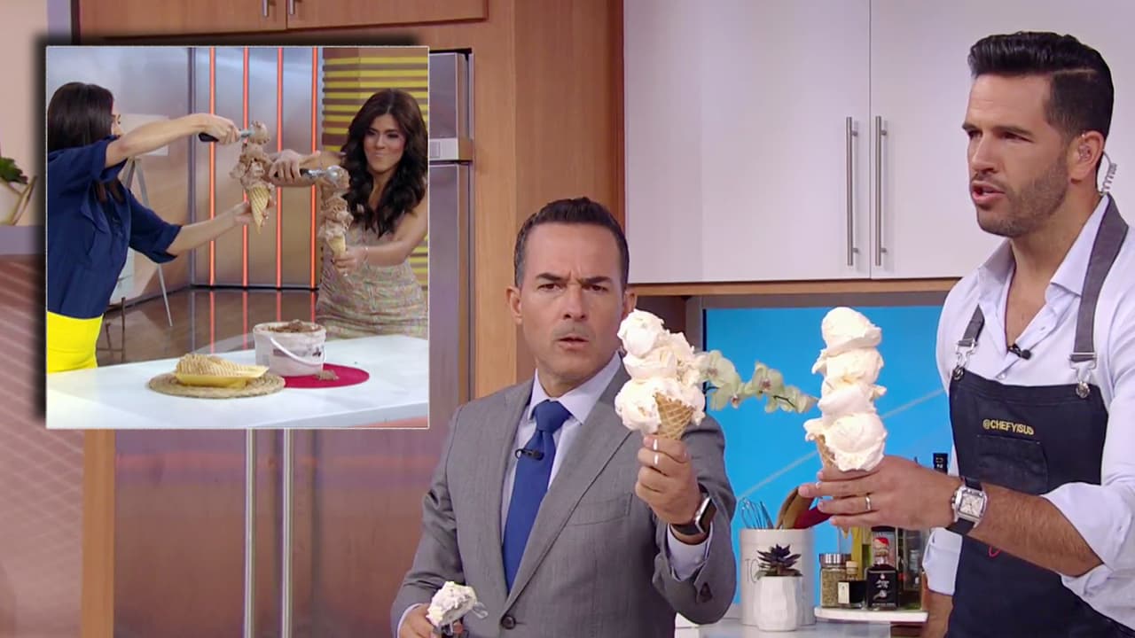 Karla Martínez y Francisca Lachapel se enfrentaron a Carlos Calderón y al Chef Yisus a ver quién podía construir una torre de bolas de helado –sobre un simple cono– en el menor tiempo posible. Y aunque al final ellos fueron declarados ganadores, ellas alzaron la voz y exigieron una revancha.