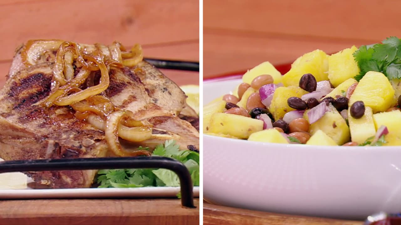 Maggie Jiménez y el Chef Pepín nos muestran paso a paso cómo hacer unas jugosas Chuletas a la BBQ y una original Ensalada de Frijol y Piña.