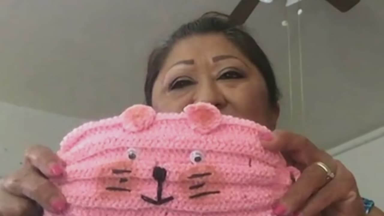 Gancho y estambre en mano, hispana de California le hace frente al desempleo tejiendo cubrebocas