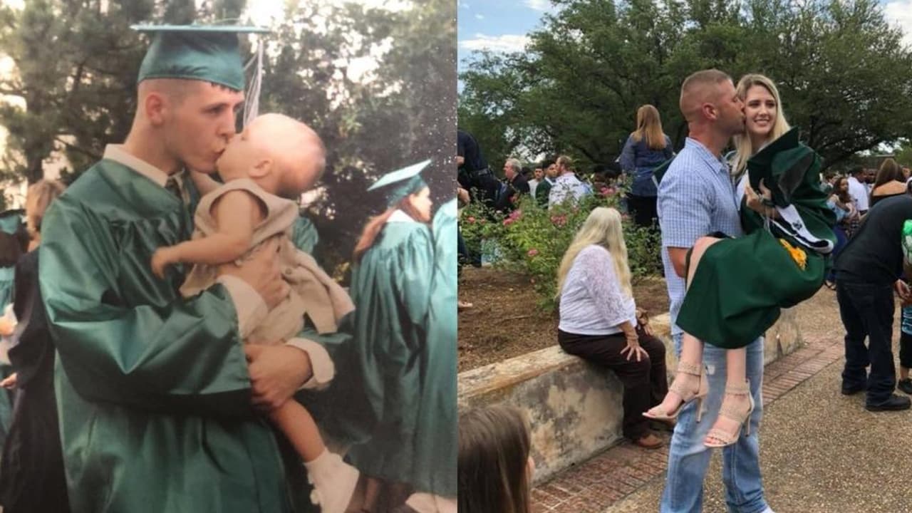 Ambos finalizaron sus estudios de preparatoria en la misma escuela en Huntsville Texas. En la primera imagen se ve a un estudiante con toga y birrete cargando a su hija pequeña; del otro lado, el mismo hombre aparece 18 años después sosteniendo a su hija graduada.