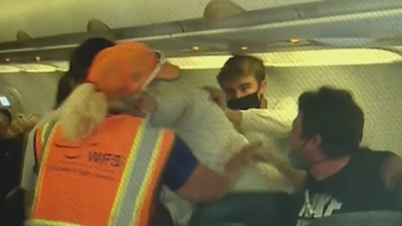 El video muestra cómo en cuestión de segundos los pasajeros de un vuelo que iba de Arizona a Utah se lanzan contra un individuo que se negaba a usar el cubrebocas antes de despegar. Tras enfrentar gritos, empujones y hasta jalones de cabello, el hombre tuvo que descender del avión, aunque finalmente sí pudo viajar.