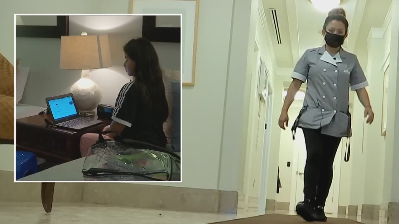 Denisse batalla para despertarse temprano. Su madre, Rocío Pineda, no cuenta con la ayuda de alguien que pueda cuidar de su pequeña mientras toma sus clases virtuales, así que las dos salen muy temprano de casa todos los días para cumplir con sus respectivas responsabilidades desde el sitio de trabajo de la madre hispana, a quien sí apoya su jefe para llevar cada día a su hija.
