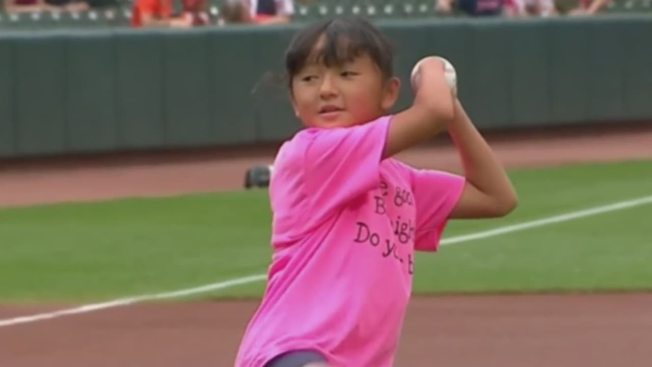La niña que sin manos ganó una competencia de caligrafía lanza la primera bola y le da suerte a los Orioles