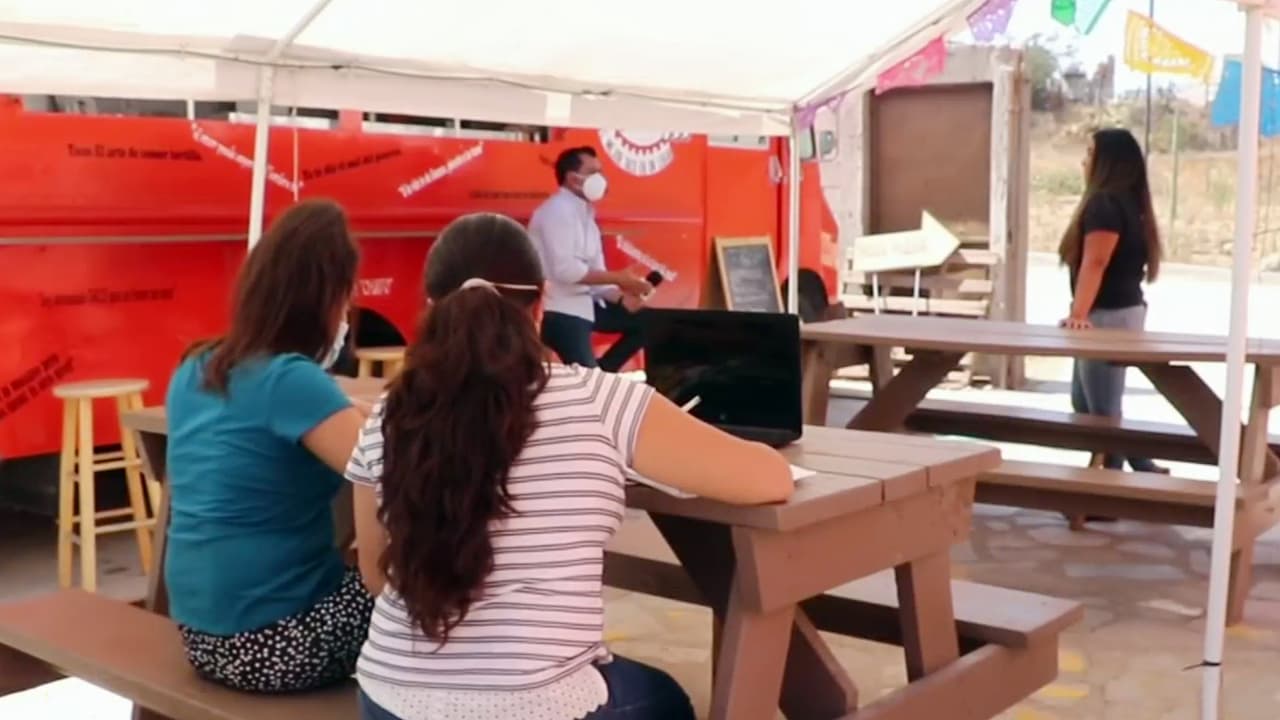 Pensando en ayudar a la gente de su comunidad que no tiene un fácil acceso a internet, Sarahí Llerenas abrió el patio de su taquería rodante para todos los niños que deseen tomar clases en línea ahí. Esta mujer que radica en Tecate, México, asegura que no le quita nada y sí le llena mucho ver cómo los pequeños pueden continuar con su educación a pesar de la pandemia.