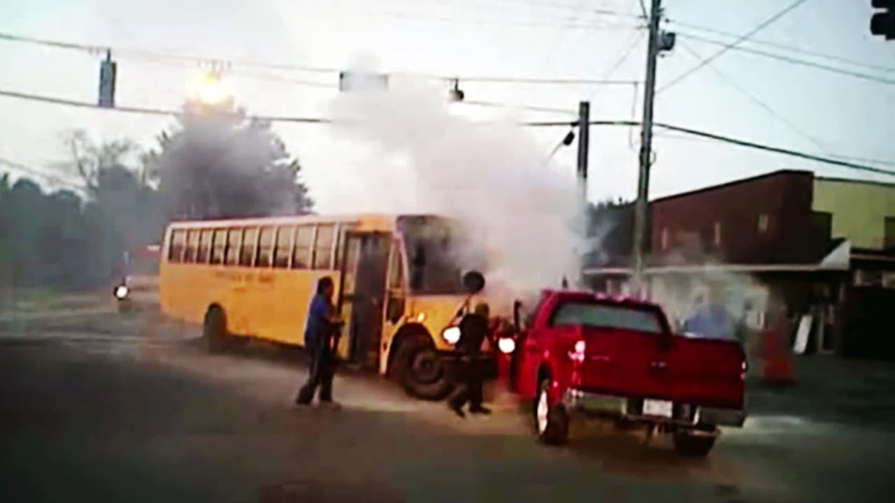 Tras chocar contra un autobús escolar, un auto se prendió en fuego con su conductor dentro. Rápidamente, agentes de policía corrieron a su rescate.