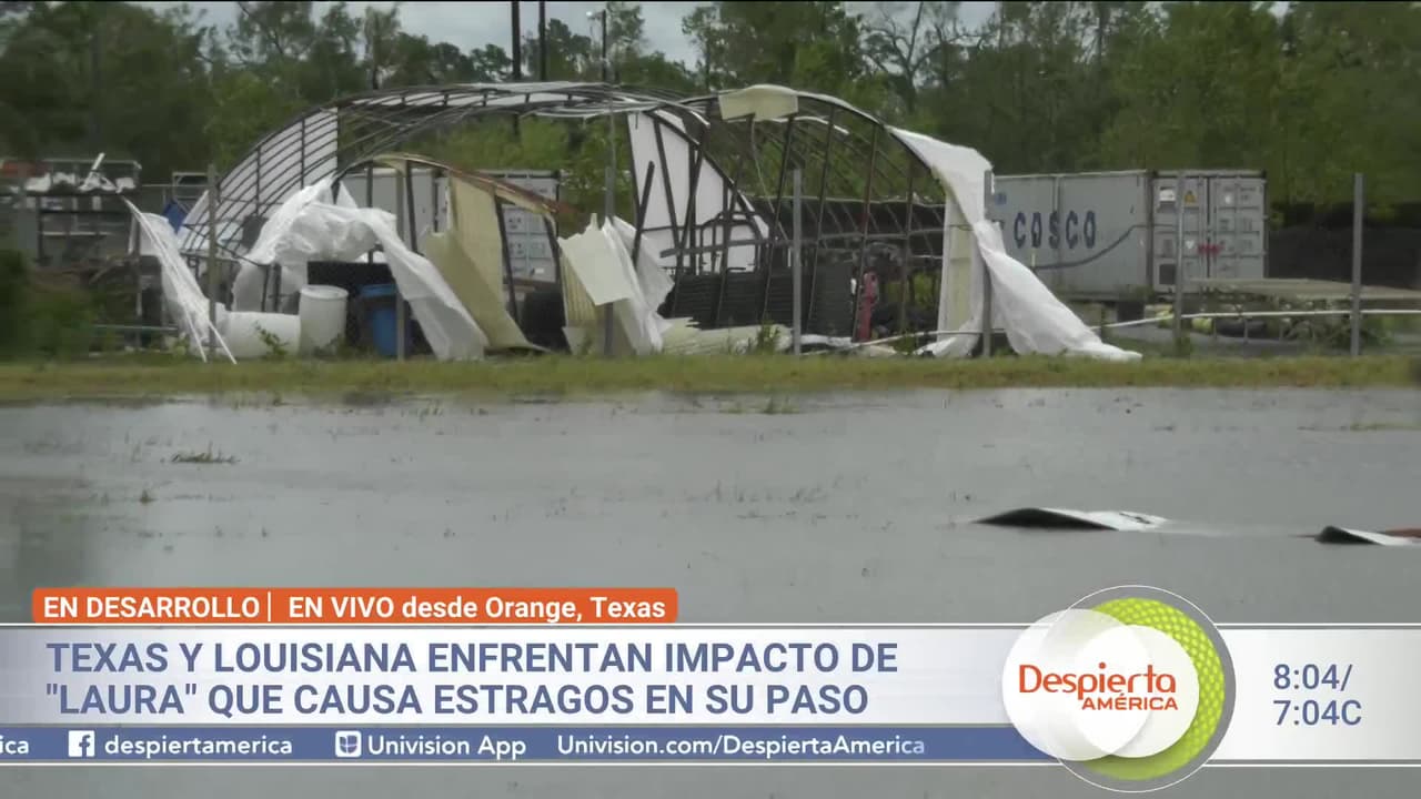 Un escenario de más de 10 horas de lluvias y fuertes vientos se vivió en Orange, Texas, con la llegada del huracán Laura a tierra. Además de las inundaciones, entre los efectos están árboles derribados y estructuras destrozadas.