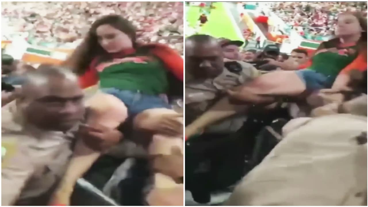 El video publicado en redes sociales muestra el momento en que la mujer agrede al oficial y este le responde de forma violenta mientras la sacaba del estadio.