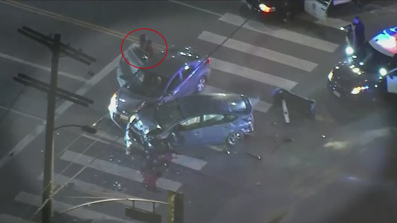 Un sospechoso de robo perseguido por las autoridades estrella su vehículo contra dos más en una intersección de Los Ángeles. Tomas aéreas captan cómo tras recibir el impacto una mujer saca a tres niños del asiento trasero y los lleva a la acera con ayuda de la policía para ponerlos a salvo.