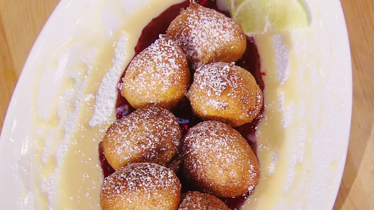 Cierra con broche de oro tu velada con estos pequeños postres que encantarán a todos. La chef Lorena García le da un giro a la receta tradicional de buñuelos, agregándoles ralladura de limón y salsa de chocolate blanco.