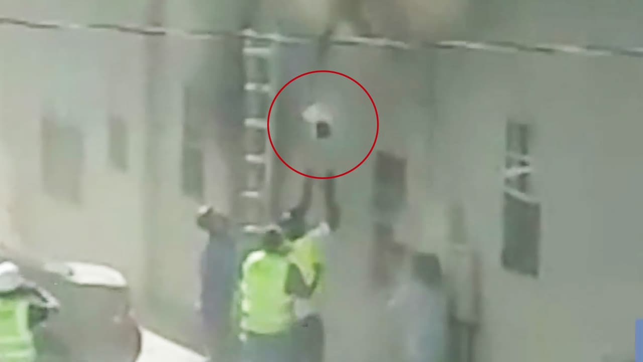 Primero fue una pequeña de dos meses de nacida, quien es recibida abajo por un trabajador sin experiencia en rescates. Segundos después pasa lo mismo con un niño de no más de tres años. Luego de poner a sus hijos a salvo, la familia escapa por las escaleras de bomberos.