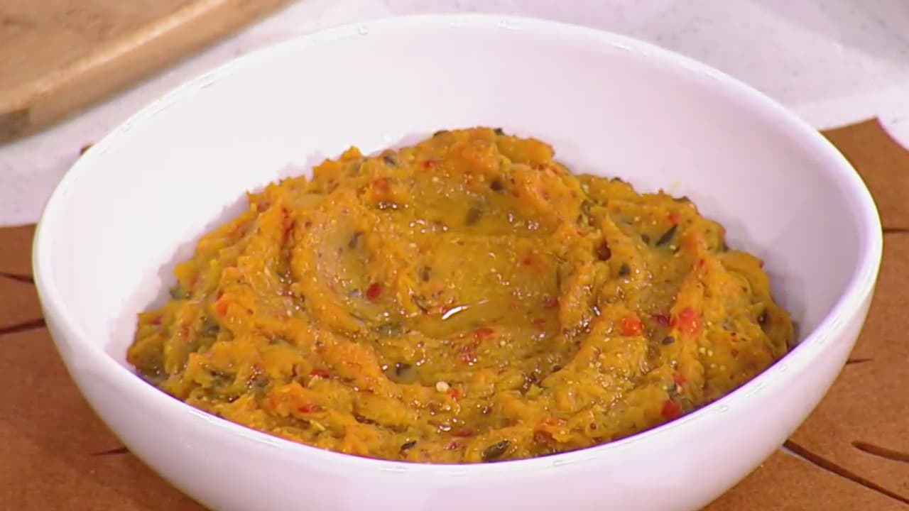 Estás a tiempo de incluir este exquisito platillo en el menú de tu cena de Thanksgiving, sobre todo porque es muy fácil y rápido de preparar. Sigue paso a paso las instrucciones de la chef Lorena García para servir como guarnición para el pavo este puré de calabaza rostizada con un toque de pimientos.