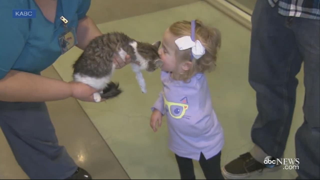 La niña de dos años perdió su brazo izquierdo a raíz de un extraño cáncer. Al felino le amputaron su patita por un accidente.