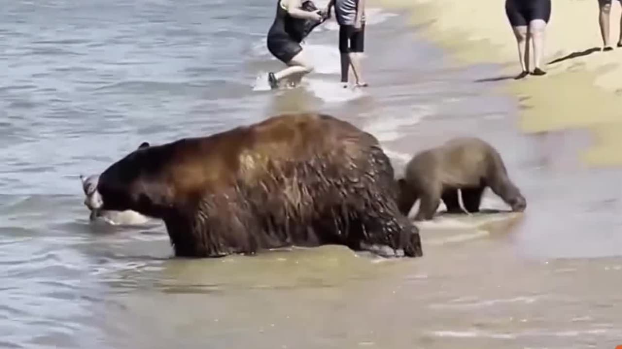 No solo los turistas gozan de la frescura de las playas en California: una mamá osa y sus tres pequeños caminan entre los visitantes, comen varias sobras de alimentos y van a refrescarse al mar. Pero no lo hacen solos: un grupo de patos se unió al refrescante chapuzón.