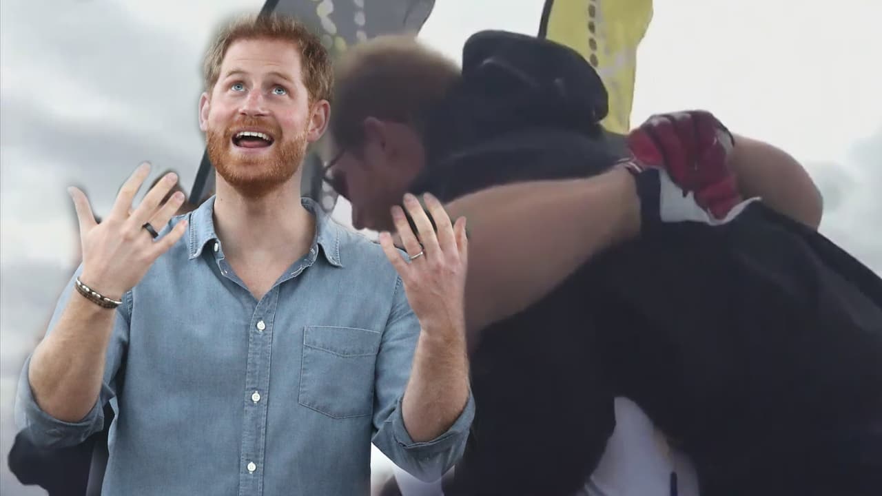 Con cargada incluida, el príncipe Harry recibió un fuerte abrazo que casi lo deja sin aliento
