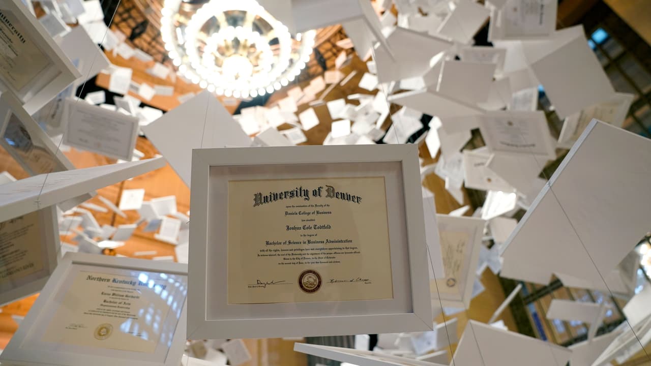 Esta obra, integrada por 2,600 títulos universitarios reales, se encuentra en la icónica estación de trenes de Nueva York y busca demostrar lo cara que es la educación universitaria en Estados Unidos. Para obtener su diploma, cada estudiante tuvo que endeudarse en promedio con 180,000 dólares, lo que significa que el valor total de esta creación artística es de aproximadamente 468 millones de dólares.