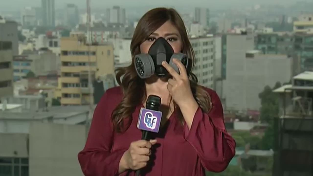 Elizabeth Curiel reporta con máscara antigas la contingencia ambiental que vive la Ciudad de México