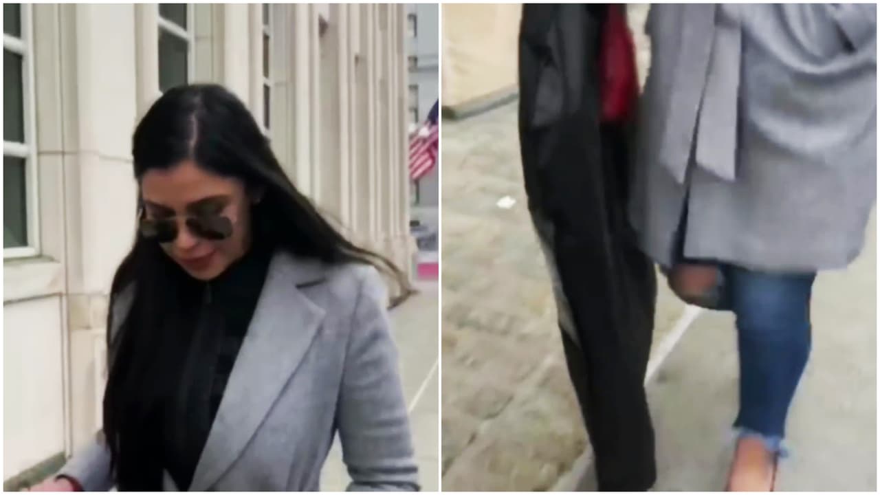 Emma Coronel llegó a la corte de Nueva York muy elegante y en compañía de una mujer. En su mano llevaba un traje que utilizaría el narcotraficante en una de sus audiencias.