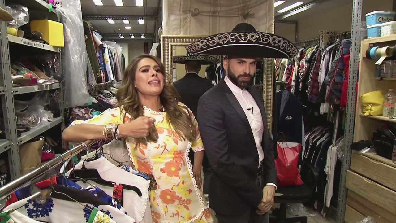La conductora de 'Pequeños gigantes' aprovechó la visita de nuestro experto en moda para llevarlo a la bodega de la cadena mexicana. Mientras hacían varias pruebas de vestuario, ambos hablaron sobre el vestido de la discordia que usó la presentadora en Premios Lo Nuestro y que fue criticado por el 'fashionista'.