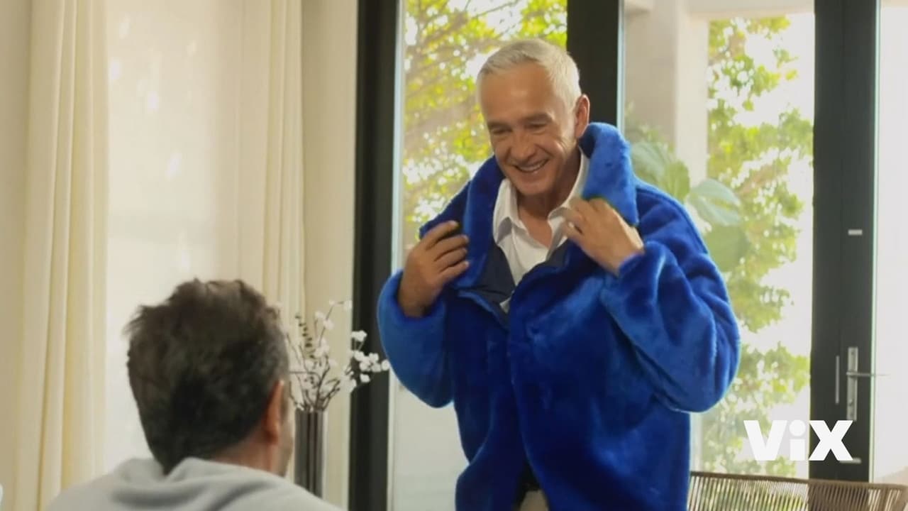 El actor sorprendió al periodista con un atuendo que utilizó en la serie cómica La Familia Peluche. Además de explicar la importancia que tiene para él ese saco, le pidió a Jorge que se lo pusiera durante su entrevista.