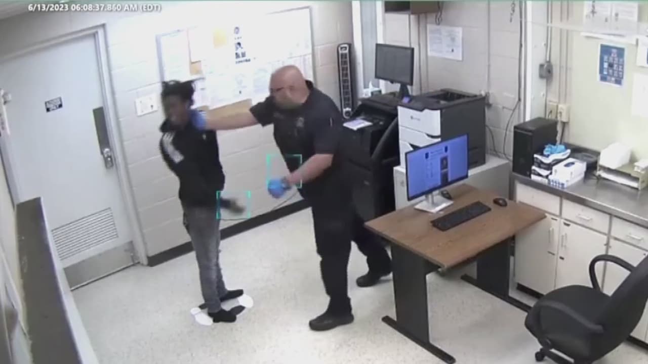 Las cámaras de vigilancia muestran como es que un policía maltrata a un recluso de 19 años sin aparente razón alguna, el uniformado ya fue suspendido y enfrenta un cargo de asalto y agresión que podría llevarlo a prisión.